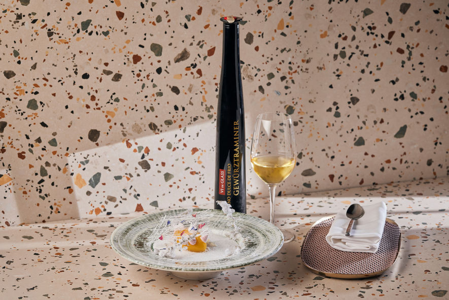 Amandus restaurant. Pairing „Frost“: Plum, almonds, quince and Gramona Vi de Glass Gewürztraminer.