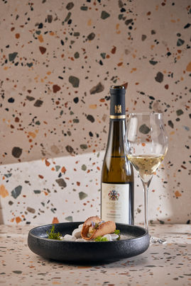 Derinys: „Coffée & Mushroom créme caramel“ su cukruotais burokėliais, morkomis ir citrinine verbena su Weingut Sattlerhof TBA, Sauvignon Blanc 2017 iš Südsteiermark, Austrija