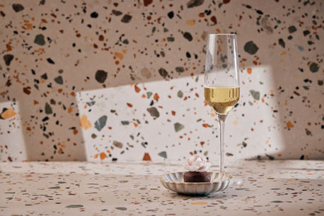 Justa Pasta restaurant. Pairing „Pera rosa“: Hazelnuts, flour, pear, wine, sugar, powdered sugar, butter, gelatin, cinnamon, anise, cloves, cardamom, vanilla and Brut Rose Metodo Classico wine.
