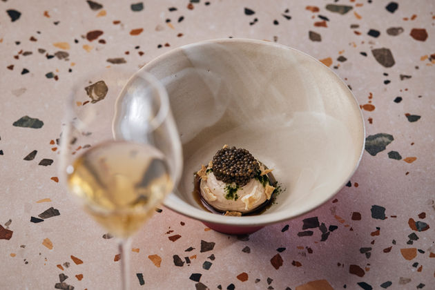 Taurakalnis Catering and Vyno klubas. Pairing „A Garden of a Monk: Pears & Spices“: Pears in various forms, seven spices, homemade lemon and ginger ice cream, cardamon gel, gold leaf, and almond pastry crumbs and Kesselstatt Riesling Piesporter Goldtropfchen Auslese #5 2019 wine.